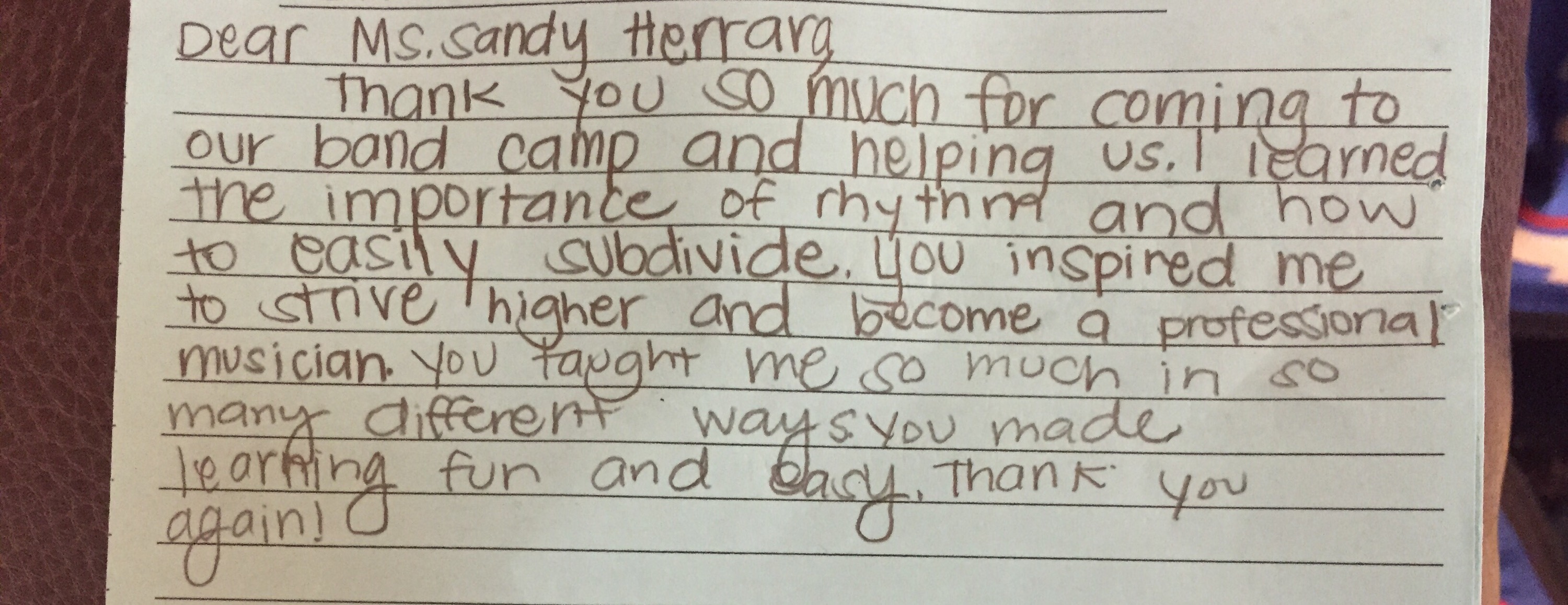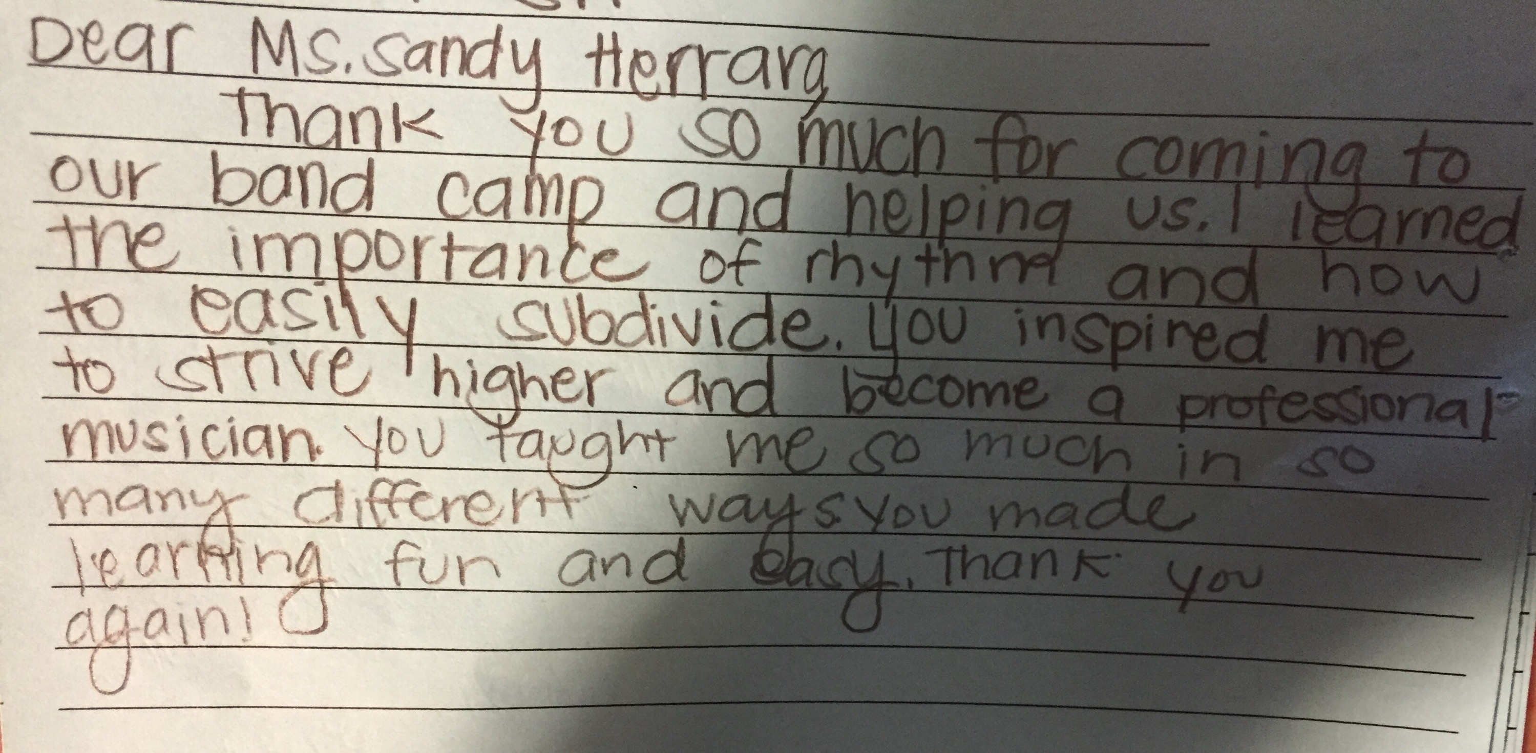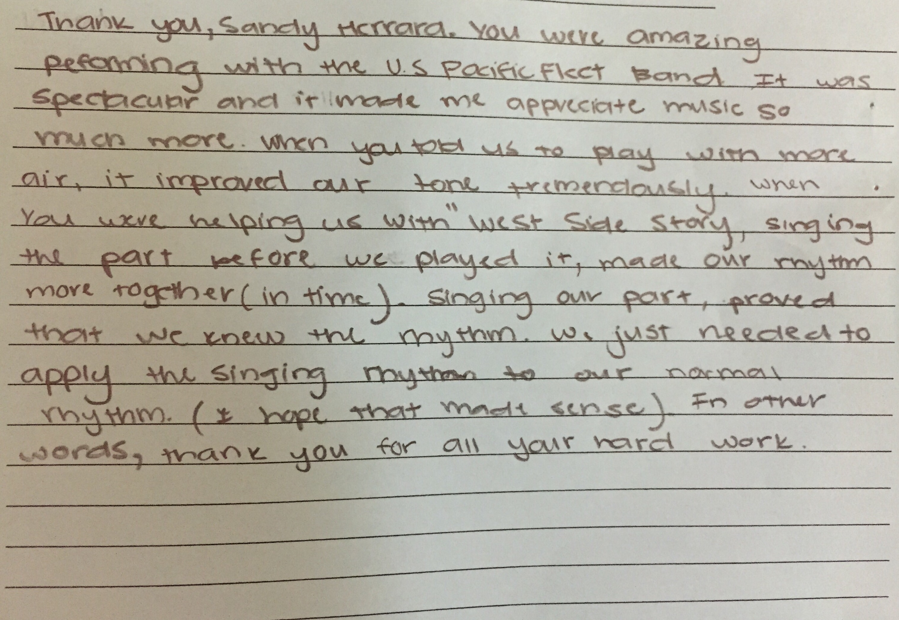Last Friday, I had the pleasure of being a clinician at a middle school band camp. The gig was through the Navy, which is a first for me. I normally do this on the civilian side, but it was fun to do it in uniform! Anyway, all the students wrote little notes for us, and I wanted to share some of them because it truly touched my heart. Sometimes it’s hard to recognize how I do with these things. I usually leave thinking, ‘I hope they learned something’, or ‘I hope I had an positive impact on them’. But this time, I have PROOF that I did leave an impression, and that is worth more to me than gold.