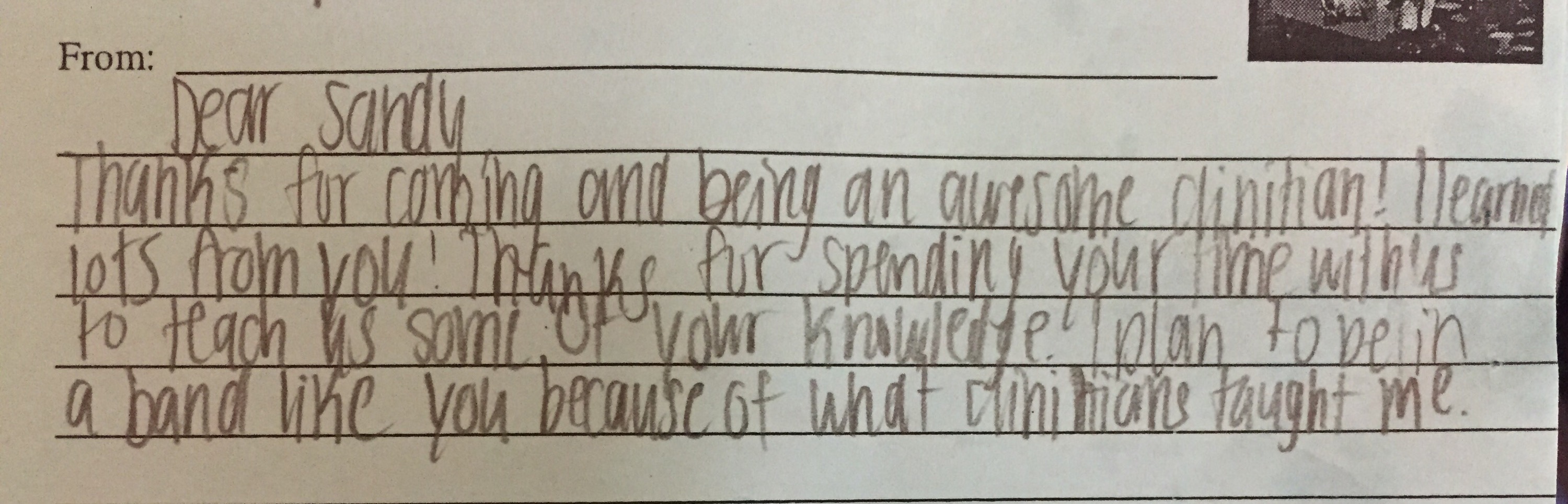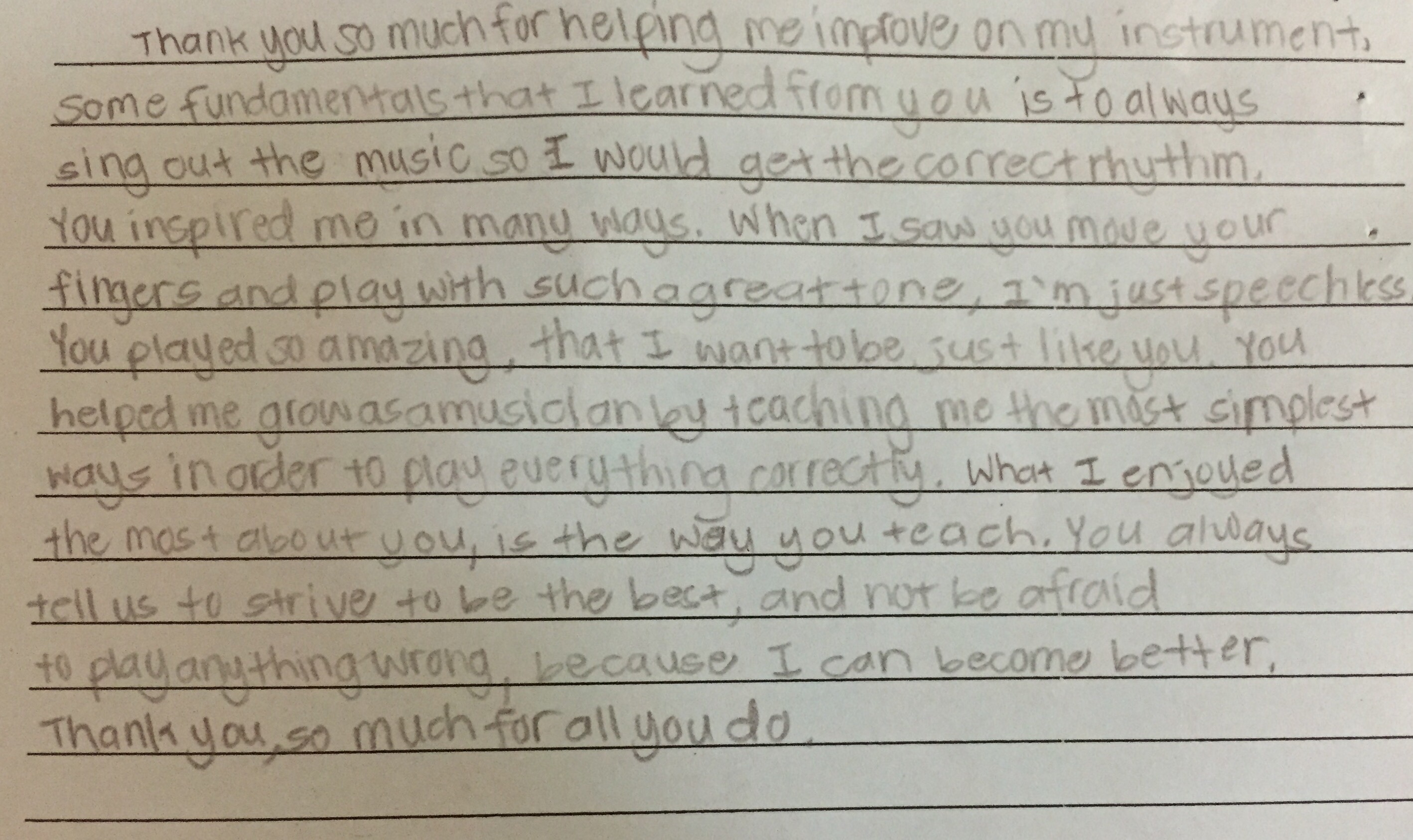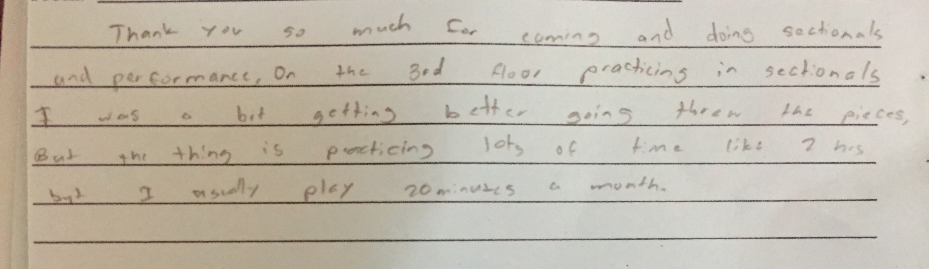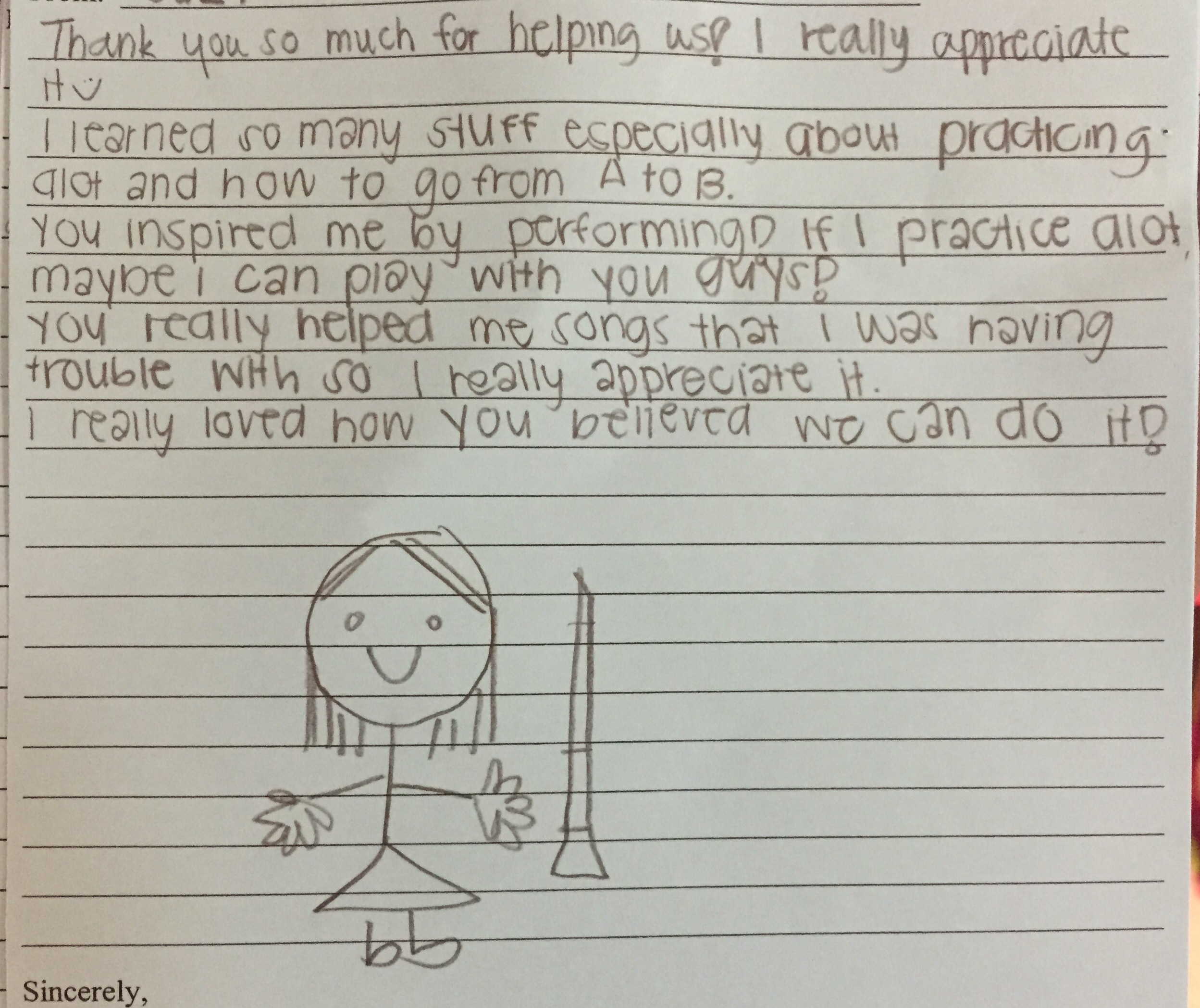 Last Friday, I had the pleasure of being a clinician at a middle school band camp. The gig was through the Navy, which is a first for me. I normally do this on the civilian side, but it was fun to do it in uniform! Anyway, all the students wrote little notes for us, and I wanted to share some of them because it truly touched my heart. Sometimes it’s hard to recognize how I do with these things. I usually leave thinking, ‘I hope they learned something’, or ‘I hope I had an positive impact on them’. But this time, I have PROOF that I did leave an impression, and that is worth more to me than gold.